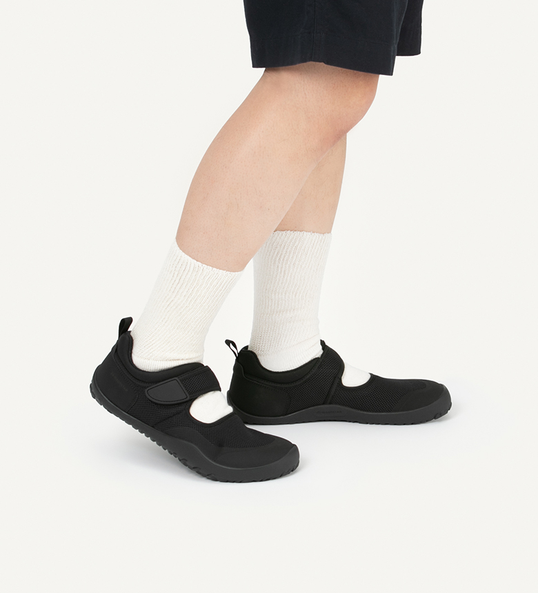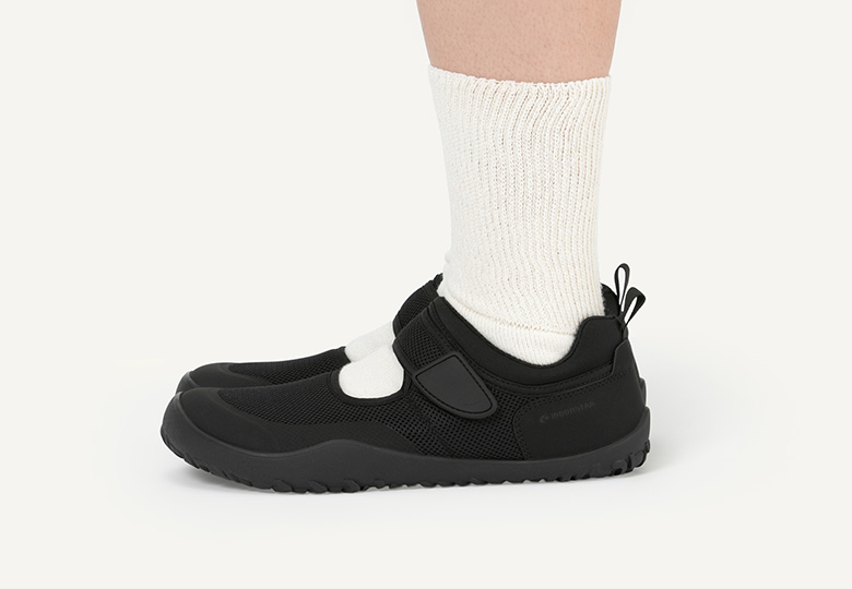 ムーンスターが長年つくってきた地下足袋をベースに考えられた靴です。裸足のようにしっかり足指で地面をとらえることができるため、足場の不安定なアウトドアシーンにも適しています。通気性の良いメッシュ素材を使い、インソールの裏にもパンチングを入れることで、素足でも快適に履けるよう仕立てています。脱ぎ履きも簡単なバンドタイプです。