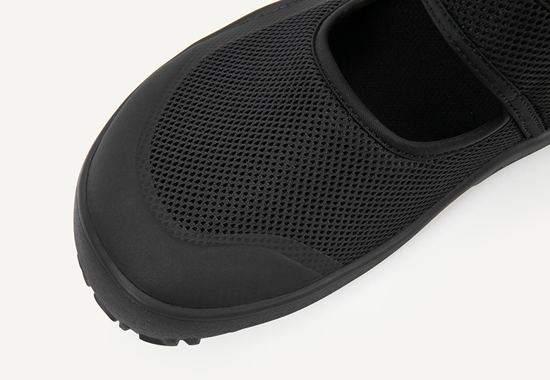 アッパーには一枚もののメッシュ素材を使用し、素足でも快適に履けるよう仕立てています。つま先や踵には耐久性をもたせるよう補強材をつけています。